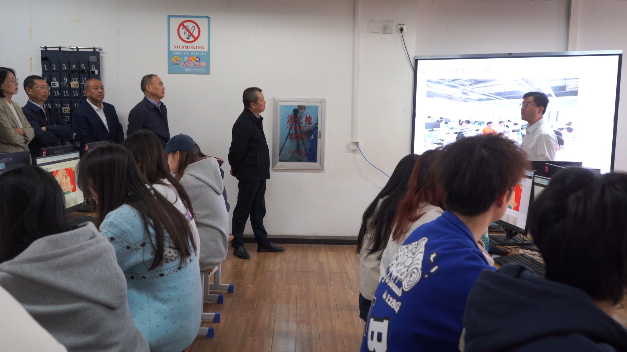 观摩团首站参观长江楼6楼网站开发实训室,感受学院整体教学场景。雷茹介绍,人工智能学院实训中心除承担本院及部分外院的专业课程实训教学任务外,还利用周末及假期承接各种社会化考试等任务,充分发挥社会化服务功能。同时在技能培训、学生竞赛、社团活动等方面提供全方位的服务与支持。