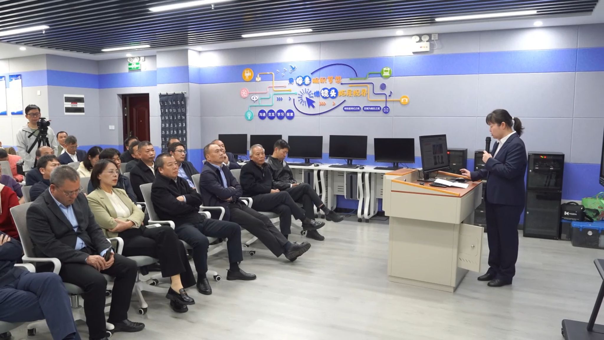 在长江楼408B数字影音实训室,雷鸣介绍了数字媒体技术专业近几年取得的成果,“智媒短视频工作室”承接真实项目,聚焦于运用“人工智能+传媒”技术,服务于商品短视频、文化类短视频的产出。