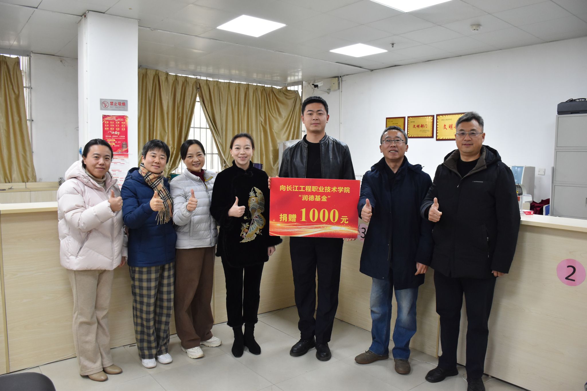 12月26日下午,人工智能学院2025年国家奖学金获得者刘永豪,向学校“润德基金”捐款1000元,用于帮助家庭困难的同学。党委学生工作部部长杨艳、人工智能学院党总支书记汪吉平、副书记黄宝玉、财务处工作人员文英、“筑梦启航”资助育人工作室负责人王珏以及辅导员徐晓晖共同为刘永豪颁发捐赠证书。