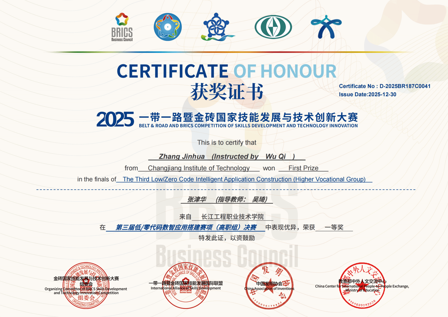 近日,2025年“一带一路”暨金砖国家技能发展与技术创新大赛之第三届低/零代码数智应用搭建赛项决赛圆满收官。人工智能学院凭借“产教融合、精准育人”的鲜明特色,在全国114所高职院校1152支队伍、37所本科院校510支队伍的激烈角逐中脱颖而出,斩获1项一等奖、4项二等奖、4项三等奖,学校获评最佳组织奖,吴琦、黄媛、何毅平、史子静4名教师荣获优秀指导教师称号,用亮眼成绩彰显了我校在人工智能与大数据领域人才培养领域的坚实根基与显著优势。