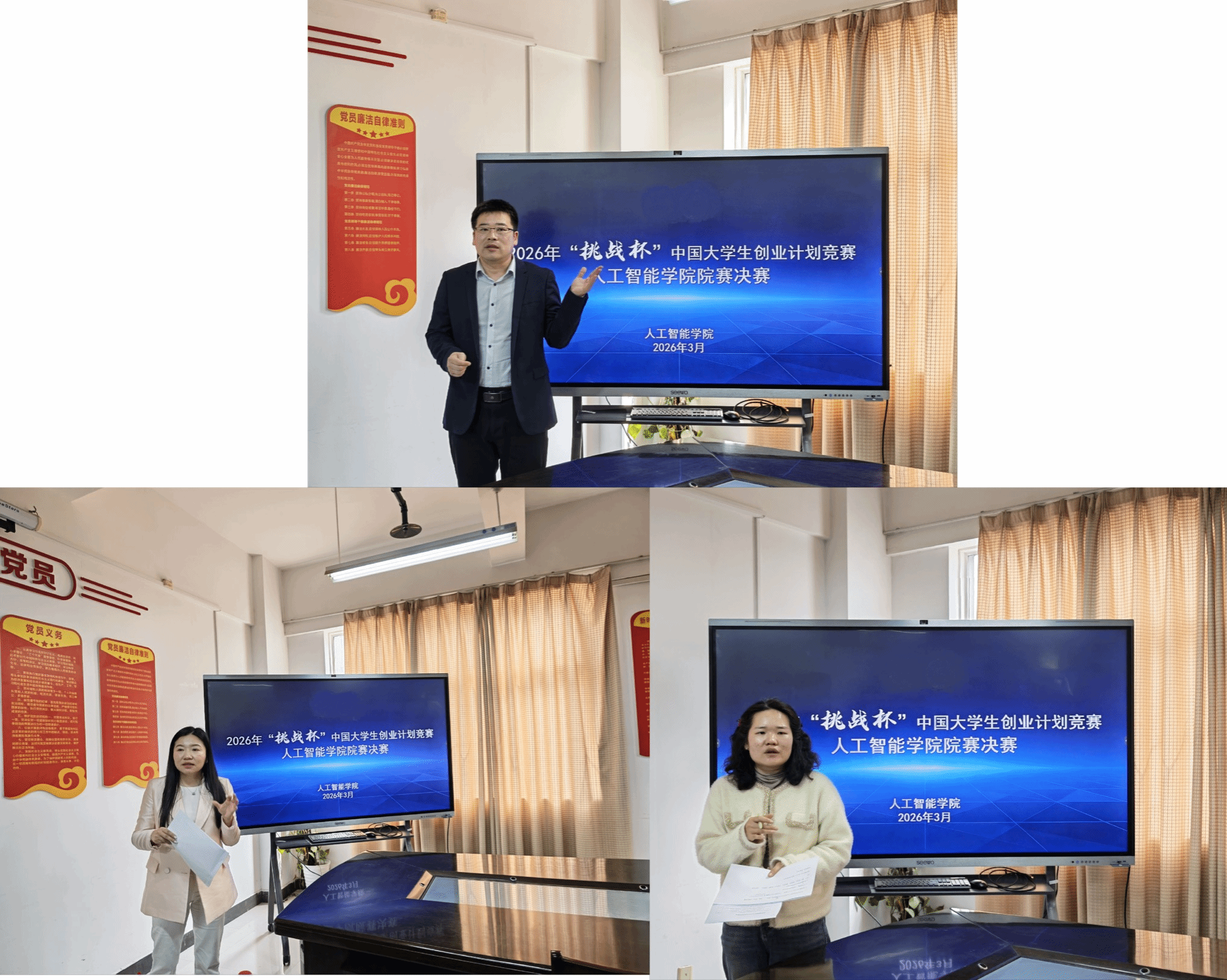 为响应学校赛事部署,深化创新创业教育,培养学生创新与创业能力,3月27日,人工智能学院2026年“挑战杯”大学生创业计划竞赛成功举办。比赛邀请招生与就业指导处处长杜捷涌,保卫处处长黄宝玉,学工部副部长葛璇,综合素质教研室副主任姚蓝洁与我院党总支书记曹冬红,院团委书记石君兰,院团委副书记姜博达组成评审团。