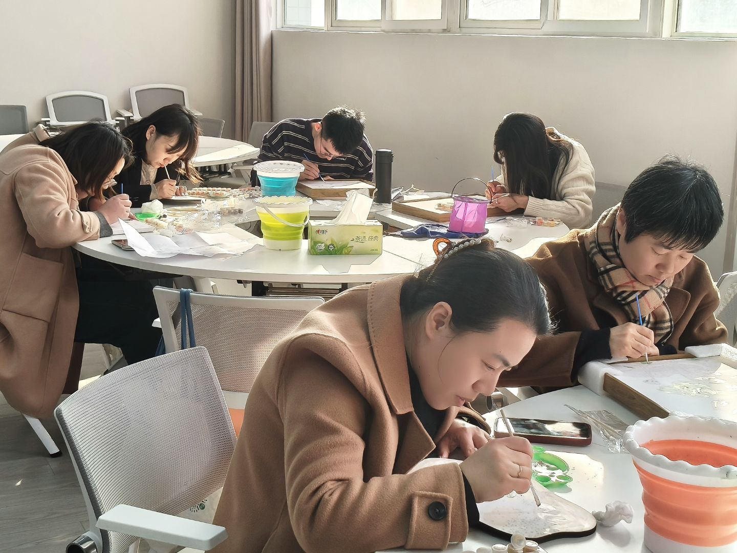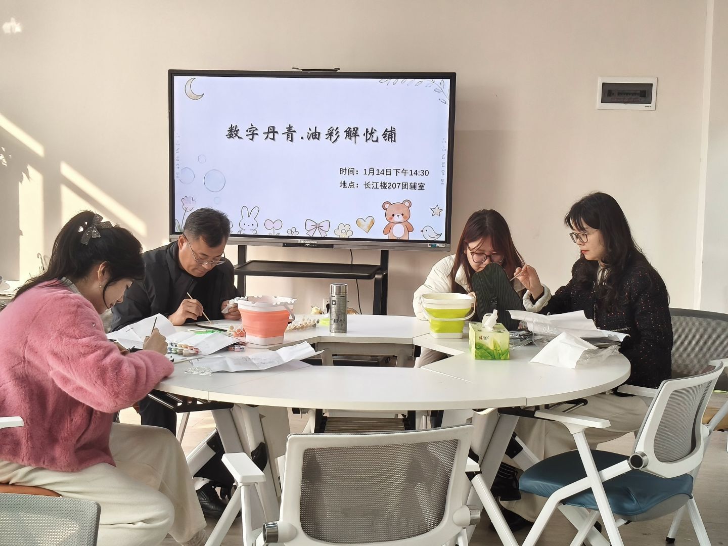 1月14日下午,人工智能学院在长江楼207开展“数字丹青·油彩解忧铺”数字油画减压活动,学院党总支副书记黄宝玉和全体辅导员参与活动,党委学生工作部副部长张欣及部分老师受邀参加,一同在油彩世界中舒缓压力。